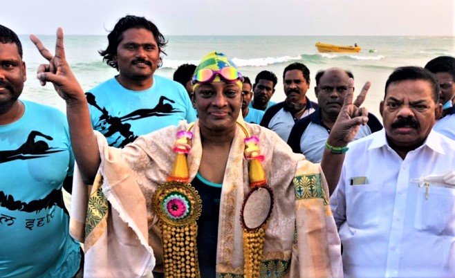 இந்நிலையில், பல்வேறு நீச்சல் போட்டிகளில் சாதனை படைத்த தெலுங்கானா மாநிலம் ஹைதராபாத்தைச் சேர்ந்த சியாமளா கோலி வயது-48, தலைமன்னாரில் இருந்து தனுஸ்கோடி வரையிலான சுமார் 30 கி.மீ. தூரம் கொண்ட பாக் ஜலசந்தி கடற்பகுதியை நீந்தி சாதனை படைத்தார்.