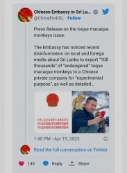 இதேவேளை நேற்றைய தினம் இலங்கைக்கான சீன தூதரகம் இலங்கையிலிருந்து குரங்குகளை கொள்வனவு செய்வது தொடர்பான எந்த பேச்சுக்களும் அரச தரப்பில் இருந்து இடம்பெறவில்லை என தனது உத்தியோகபூர்வ ட்விட்டர் பக்கத்தில் தெரிவித்திருந்த நிலையில் விவசாய அமைச்சர் மஹிந்த அமரவீர குரங்குகளை சீனாவுக்கு அனுப்புவது தொடர்பில் அமைச்சரவையில் தெரிவிப்போம் என குறிப்பிட்டுள்ளமையும் நோக்கத்தக்கது.