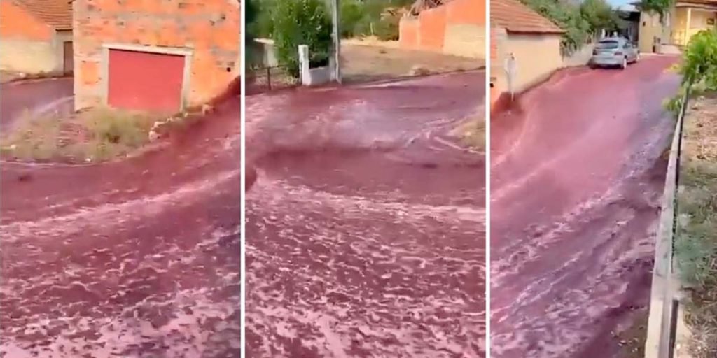 தென்மேற்கு ஐரோப்பாவில் உள்ள நாடு போர்த்துக்கல். இதன் தலைநகரம் லிஸ்பன். தலைநகரிலிருந்து சுமார் 240 கிலோமீட்டர் தொலைவில் உள்ளது அனாடியா பகுதி. இங்குள்ளது சவோ லவுரென்கோ டோ பைர்ரோ பகுதி. சுமார் 2 ஆயிரம் பேர் வசிக்கும் இந்த ஊரில் டெஸ்டிலேரியா லெவிரா எனும் மது உற்பத்தி தொழிற்சாலை செயல்பட்டு வருகிறது. இத்தொழிற்சாலையில் ரெட் வைன் எனப்படும் கருந்திராட்சைகளில் இருந்து காய்ச்சி வடிகட்டி, பதப்படுத்தப்படும் மது தயாரிக்கப்படுகிறது. இங்கு இவர்கள் தயாரிக்கும் மது, மிக பெரிய அளவிலான பீப்பாய்களில் தேக்கி வைக்கப்படும். இந்நிலையில் அவ்வாறு தேக்கி வைக்கப்பட்ட இரு பீப்பாய்கள் உடைந்ததால், அதிலிருந்த மது சாலைகளெங்கும் ஓடியது. ரத்த ஆறு போல சிவப்பு நிறத்தில் ஓடிய இதனை பலரும் வீடியோ எடுத்து சமூக வலைதளங்களில் வெளியிட்டனர்.