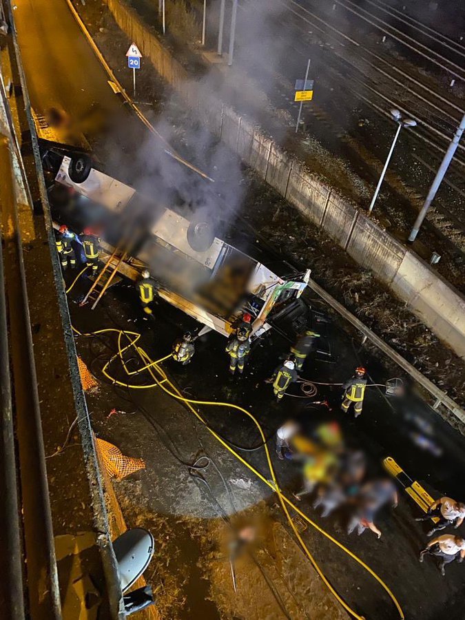 வடக்கு இத்தாலியின் வெனிஸ் அருகே உள்ள மேம்பாலத்தில் இருந்து கேம்ப்கிரவுண்டிற்கு சுற்றுலாப் பயணிகளை ஏற்றிச் சென்ற பேருந்து ஒன்று தீப்பற்றி விபத்துக்குள்ளாகியுள்ளது.