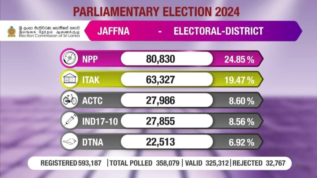 இலங்கையின் வரலாற்றில் முதற் தடவையாக யாழ்ப்பாணத்தில் தமிழ் தேசியக் கட்சி இரண்டாம் நிலைக்குத் தள்ளப்பட்டது இதுவே முதற் தடவையாகும். இந்நிலை யாழ் மாவட்டத்தில் மட்டுமல்லாமல் வடக்கு கிழக்கின் ஏனைய மாவட்டங்களிலும் காணப்படுகின்றது. தேசிய மக்கள் சக்தி தமிழர் பெரும்பான்மையாக வாழும் அனைத்து மாவட்டங்களிலும் கூடுதல் வாக்குகளைப் பெற்று நாட்டில் மட்டுமல்ல தமிழ் மக்களின் பூர்வீக தாயகப் பிரதேசங்களிலும் கூடுதல் வாக்குகளையும் ஆசனங்களையும் பெற்றுள்ளது. தேசிய மக்கள் சக்தி திசைகாட்டி யாழில் மூன்று ஆசனங்களையும் தமிழரசுக் கட்சி வீடு, தமிழ் காங்கிரஸ் சைக்கிள், ஊசி சுயேட்சைக் குழு தலா ஒரு ஆசனத்தையும் பெற்றுக்கொண்டுள்ளது.