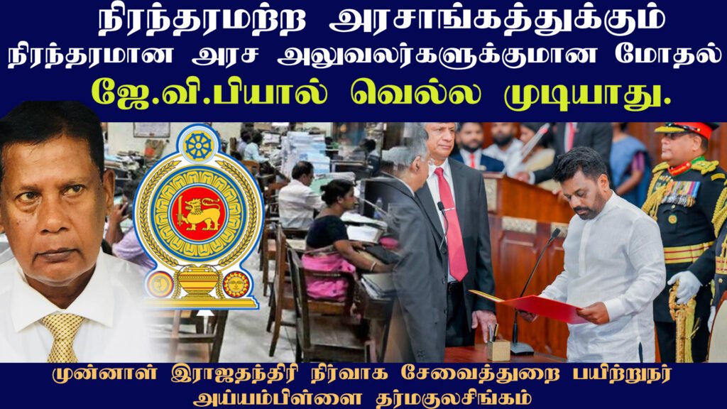 நிரந்தரமற்ற அரசாங்கத்துக்கும் நிரந்தரமான அரச அலுவலர்களுக்குமான மோதல் ! ஜேவிபியால் வெல்ல முடியாது!! முன்னாள் ராஜதந்திரி, நிர்வாக சேவைத்துறை பயிற்றுனர் அய்யம்பிள்ளை தர்மகுல சிங்கம்