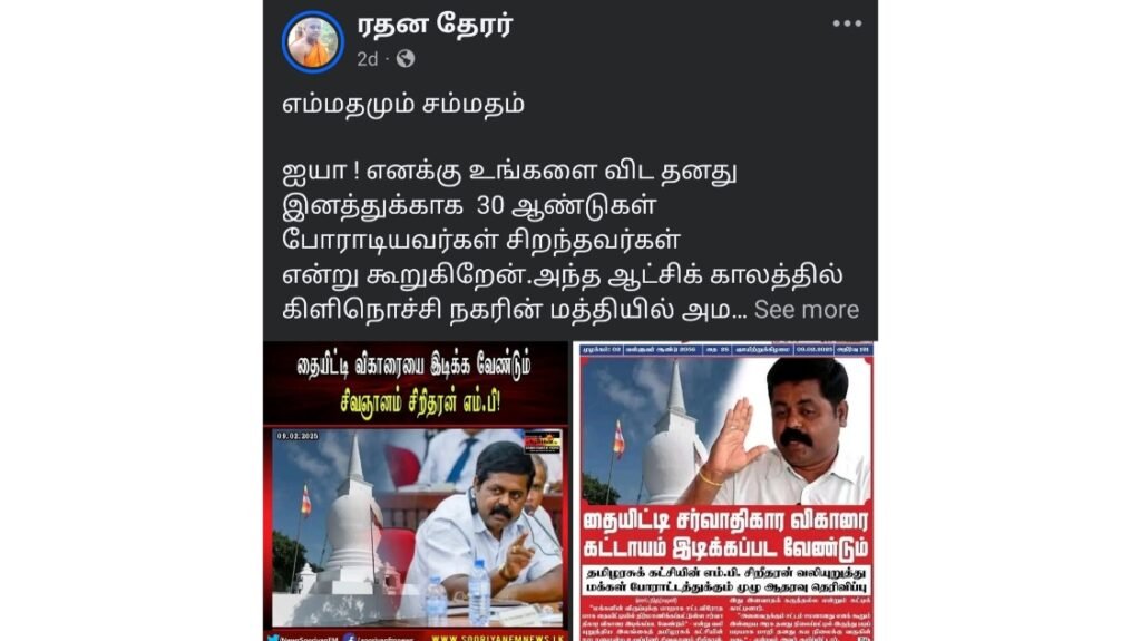 இவர்கள் யாழ் குடாநாட்டு கிணறுகளில் மலசலம் கலந்து மக்கள் நோய்வாய்ப்படுவது பற்றியும் எவ்வித கவலையும் கிடையாது. அந்தக் குடிநீருக்கும் மத்தியப்படுத்தப்பட்ட கழிவகற்றலுக்கும் ஆப்பு வைத்தவரே சிவஞானம் சிறிதரன் மற்றும் பொன்னம்பலம் கஜேந்திரகுமார் போன்ற பா உ க்கள். இவர்களுக்கு தையிட்டியில் விரல் விட்டு எண்ணக் கூடிய சிலரின் காணிகள் இழக்கப்பட்டது பற்றி எவ்வித அக்கறையும் கிடையாது. பா உ சிறிதரன் போன்றவர்களால் முண்டு கொடுத்து நிறுத்தப்பட்ட ரணில் விக்கிரமசிங்க – மைத்திரிபால சிறிசேன தலைமையிலான நல்லாட்சி அரசாங்கத்தின் தலைமையில் தான் இந்த விகாரைக்கு அடிக்கல் நாட்டப்பட்டது. இன்றைக்கு துடிக்கும் நீங்கள் அன்று அதனை நிறுத்துவதற்கு எவ்வித நடவடிக்கையும் எடுக்கவில்லை. மேலும் 1000 விகாரைகள் கட்ட திட்டம் போட்ட சஜித் பிரேமதாஸாவை ஆதரித்த தமிழரசுக் கட்சியில் தான் எஸ் சிறிதரன் இன்றும் தொங்கிக் கொண்டுள்ளார்.