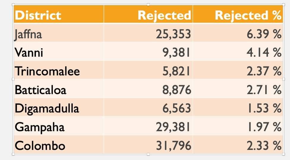இதேவேளை நிராகரிக்கப்பட்ட வாக்குகளின் முழுமையான பட்டியல் வெளியிடப்பட்டுள்ளது. குறித்த நிராகரிக்கப்பட்ட வாக்குகளின் பட்டியலில் முழுமையான இலங்கை தீவிலும் அதிகப்படியான நிராகரிக்கப்பட்ட வாக்குகளை கொண்ட மாவட்டங்களில் யாழ்ப்பாணம் முதலிடத்தை பெற்றுள்ளமையும் குறிப்பிடத்தக்கது.