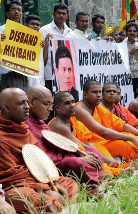 பிரித்தானிய வெளிவிவகார அமைச்சர் டேவிட் மிலிபண்டின் இலங்கை விஜயத்தைக் கண்டித்து கொழும்பிலுள்ள பிரித்தானிய உயர்ஸ்தானிகராலயம் முன்பாக ஜாதிக ஹெல உறுமய ஆர்ப்பாட்டம் மேற்கொண்டது. கைகளில் பதாதைகளை ஏந்திய வண்ணம் ஆர்ப்பாட்டக்காரர்கள் இதில் கலந்துகொண்டனர். Show More Previous Post பாடசாலைகள் மூடப்பட்டுள்ளதாக பொய்ப்பிரசாரங்களை பரப்பி அரசியல் இலாபம் தேட சிலர் முயற்சி – ஊவா முதலமைச்சர் Next Post உடனடி யுத்தநிறுத்தத்திற்கு பிரித்தானிய-பிரான்ஸ் வெளிவிவகார அமைச்சர்கள் அழைப்பு: அரசு மறுப்பு