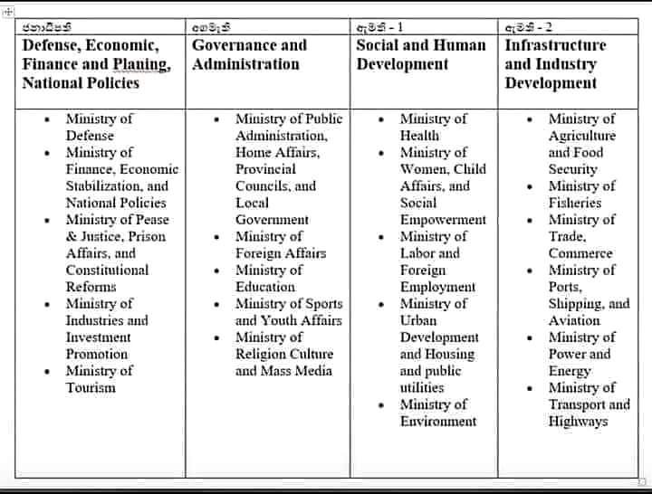 தற்போதைய 22 அமைச்சுக்கள் மேற்குறிப்பிட்ட 04 அமைச்சுக்களின் கீழ் கொண்டு வரப்பட்டுள்ளன.