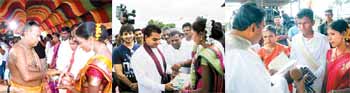 marage.jpgஇந்நிகழ்வில் பிரதியமைச்சர்களான டிலான் பெரேரா விஜித் விஜயமுனி சொய்ஸா, பாராளுமன்ற உறுப்பினர் சமல் ராஜபக்ஷ ஆகியோர் சிறப்பதிதிகளாகக் கலந்துகொண்டுள்ளதுடன் அரச மற்றும் இராணுவ உயரதிகாரிகள், மதத் தலைவர்கள், மணமுடித்த தம்பதிகளின் பெற்றோர்கள், முக்கியஸ்தர்கள் பலரும் கலந்துகொண்டனர்.