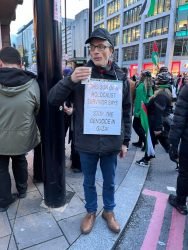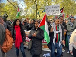 ‘ஞாபகார்த்த தின’ நாளான நவம்பர் 11இல் லண்டனில் நடைபெற்ற மாபெரும் ஊர்வலத்தில் மக்கள் சாரை சாரயாக மிகுந்த ஆக்கிரோசத்துடன் பங்கேற்றனர். ஈராக் ஆக்கிரமிப்பு யுத்தத்தை எதிர்த்து பிரித்தானிய மக்கள் வீதியில் இறங்கியதற்கு ஒப்பாக பெருவரியான மக்கள் நேற்றைய போராட்டத்தில் குதித்திருந்தனர். இன, மத, மொழி பேதமற்று போராட்த்தில் ஈடுபட்டவர்கள் பிரித்தானியப் பிரதமர் ரிசிசுனாக் மற்றும் அவரின் நம்பிக்கைக்குரிய உள்துறை அமைச்சர் சுவலா பிரவர்மன் ஆகியோருக்கு எதிராகவும் மேற்கத்தைய தலைவர்களுக்கு எதிராகவும் கோசங்களை எழுப்பினர்.