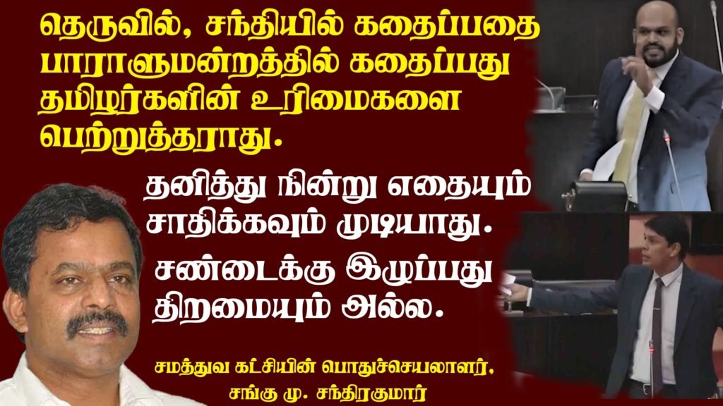 தெருவில், சந்தியில் கதைப்பதை பாராளுமன்றத்தில் கதைப்பது தமிழர்களின் உரிமைகளைப் பெற்றுத்தராது ! தனித்து நின்று எதையும் சாதிக்கவும் முடியாது ! சண்டைக்கு இழுப்பது திறமையல்ல !