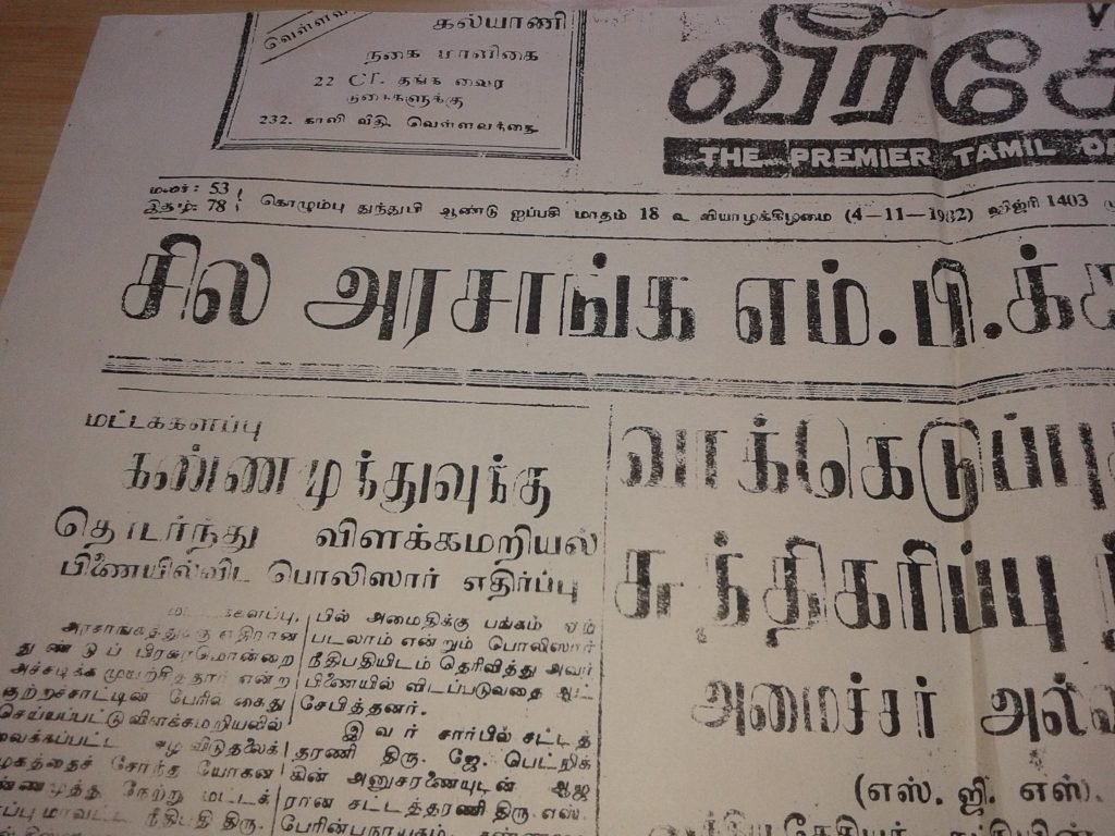 வடகிழக்கில் பாடசாலைகளை பகிஷ்கரிக்க சொல்லி எல்லாம் ஒழுங்கமைத்தாச்சு. அது தொடர்பா நோட்டீஸ் அடிக்கிறதுக்கு மட்டக்களப்பு ராஜன் அச்சகத்துக்கு நான் போனேன். அங்க ஓடர் கொடுத்திட்டேன் முதலே நோட்டீஸ் எல்லாம் அடிக்கிறதுக்கு. அண்டைக்கு போய் நோட்டீஸ் எடுத்து ரோட்ல வரும்போது அரஸ்ட் பண்ணுப்படுறேன் கையும் மெய்யுமா. அரஸ்ட் பண்ணு பட்டதும் தெரியும்தானே, ஒன்றுமே செய்ய இயலாது ஏனென்றால் கையும் மெய்யுமாக அரஸ்ட் பண்ணபடுறேன். நாங்க நோட்டிசை தமிழ் ஈழ விடுதலைக் கழகம் என்ற பெயரிலதான் அச்சிட்டிருந்தோம்.