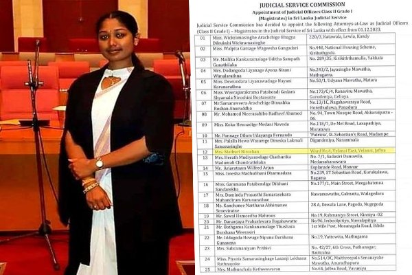 இலங்கை நீதித்துறை வரலாற்றில் மிக இளவயதில் நீதிபதியாக யாழ்ப்பாணத்தைச் சேர்ந்த தமிழ் பெண்மணி ஒருவர் தேர்வாகியுள்ளார்.