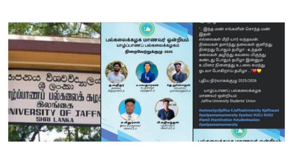 “இந்த மண் எங்களின் சொந்த மண், இதன் எல்லைகள் மீறி யார் வந்தவன். நிலைகள் தளர்ந்து தலைகள் குனிந்து நின்றது போதும் தமிழா“ என்ற புலிகளின் பாடல் வரிகளுடன் யாழ்ப்பாண பல்கழகத்தின் அனைத்து பீட மாணவர் ஒன்றியத்துக்கான 2025ஆம் ஆண்டுக்கான நிர்வாக குழு அறிவிக்கப்பட்டுள்ளது. 75 வீதத்திற்கும் அதிகமான பெண் மாணவிகளைக் கொண்ட யாழ்ப்பாண பல்கலைகழகத்தின் மாணவர் ஒன்றிய நிர்வாகத் தெரிவில் வழமை போலவே இந்த ஆண்டிலும் பெண்கள் புறக்கணிக்கப்பட்டிருக்கிறார்கள்.