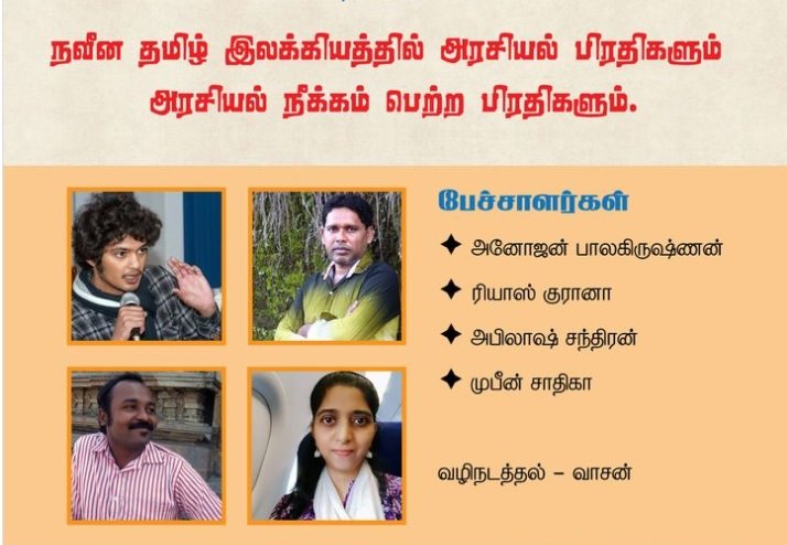 ‘நவீன தமிழ் இலக்கியத்தில் அரசியல் பிரதிகளும் அரசியல் நீக்கம் பெற்ற பிரதிகளும்’ என்ற தலைப்பில் இக்கலந்துரையாடல் ஒழுங்கு செய்யப்பட்டு உள்ளது. தமிழ் இலக்கியச் சூழல் என்பது பெரும்பாலும் தமிழக இலக்கியச் சூழலாக குறுக்கப்பட்டுள்ள நிலையில் ஒடுக்கப்பட்டுள்ள ஈழச் சமூகங்களின் இலக்கியங்களை தமிழக இலக்கியச் சூழல் மேலும் ஓரம்கட்டுகின்றதா என்ற கேள்வி உலகெங்கும் பரந்து வாழ்கின்ற ஈழத்தமிழர்கள் மத்தியில் உள்ளது. அந்த வகையில் ஈழத்து – தமிழக எழுத்தாளர்கள் இலக்கியவாதிகள் அண்மைக்காலத்தில் இணைந்து மேற்கொள்கின்ற கலந்துரையாடலும் விவாதமுமாக இது அமைய உள்ளது.